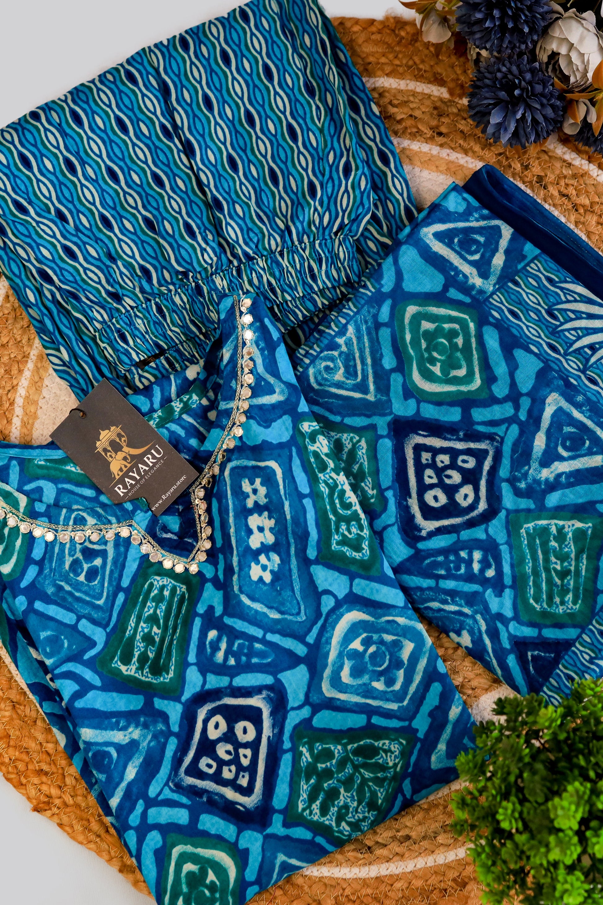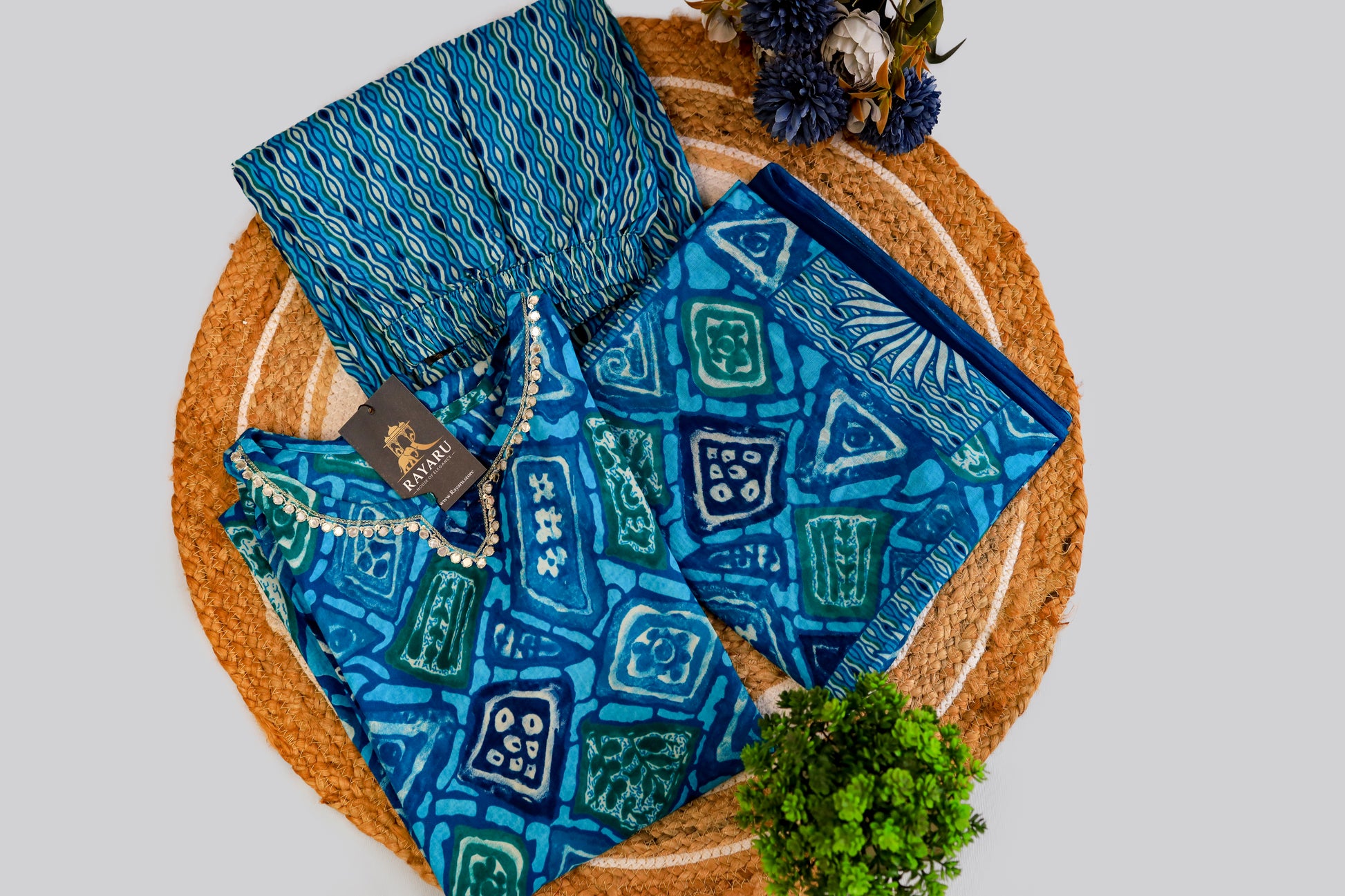 Crafted from soft, breathable cotton, this three-piece kurti set features a soothing fusion of emerald and sage green tones. Complete with a straight-fit kurti, matching pants, and dupatta, it offers comfort and charm for daily wear or casual gatherings.
