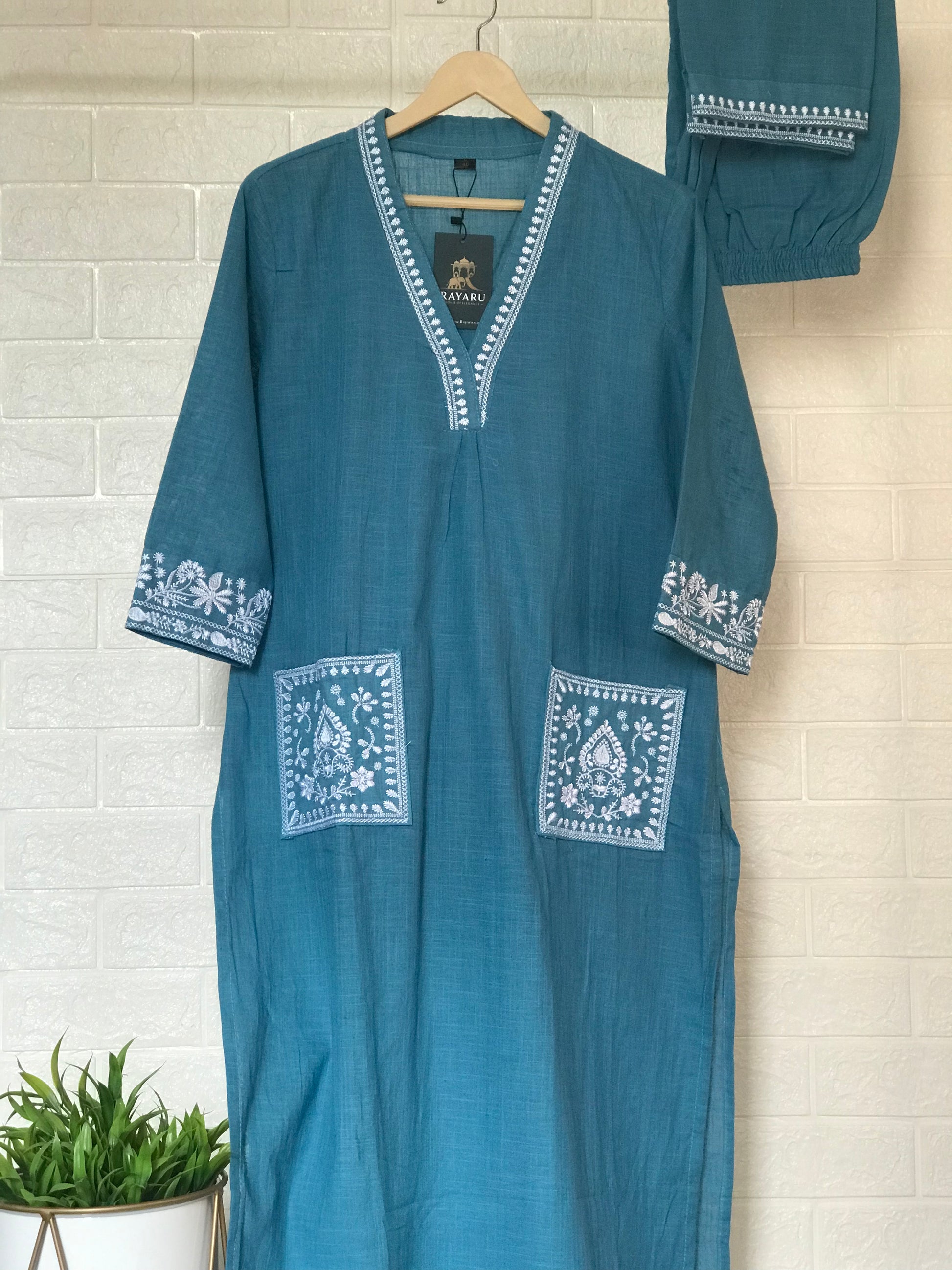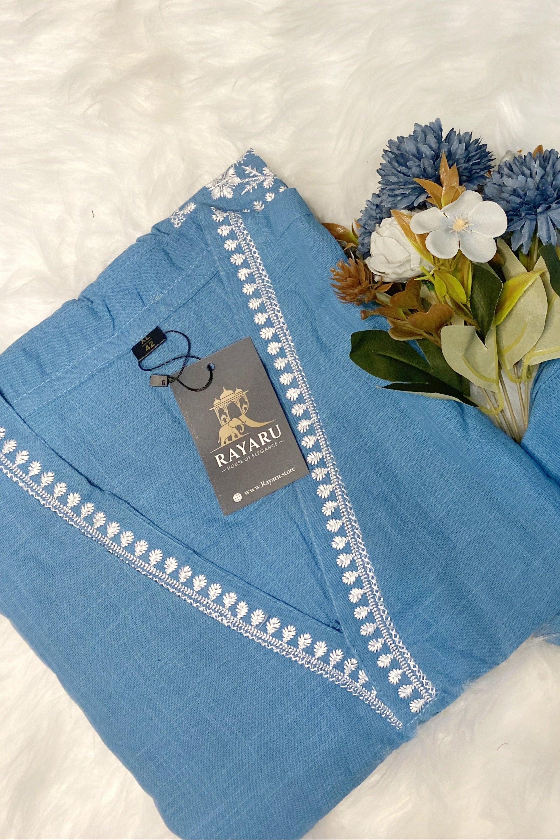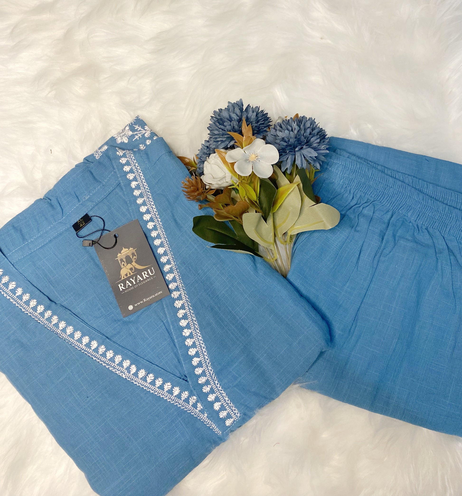 Light blue cotton kurti with matching pants, designed for everyday office wear. Comfortable, breathable, and elegant—perfect for a polished work look.