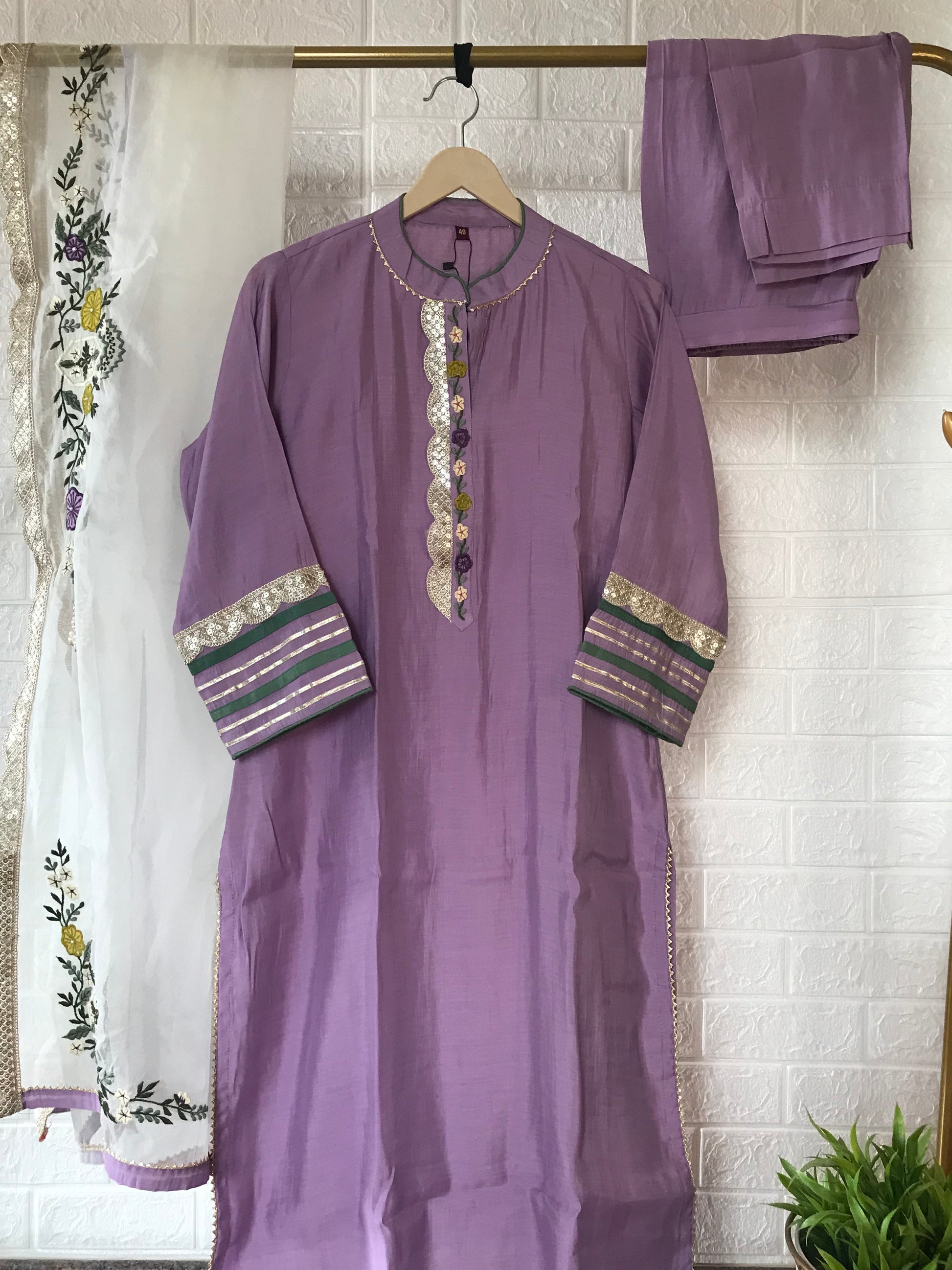 Subtle light purple kurta set in a soft, shimmery fabric featuring delicate floral embroidery and gold lace detailing, paired with matching pants and a grand dupatta.