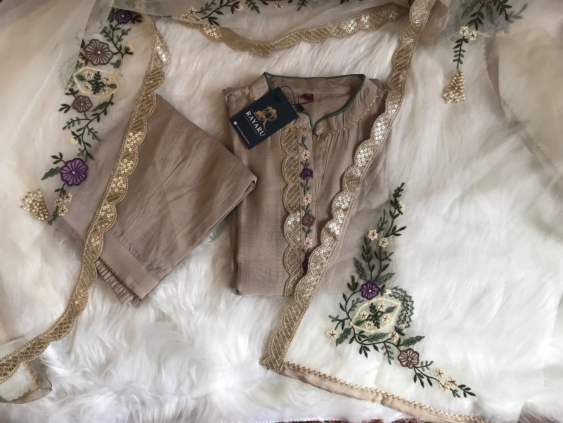 Subtle beige kurta set in a soft, shimmery fabric featuring delicate floral embroidery and gold lace detailing, paired with matching pants and a grand dupatta.