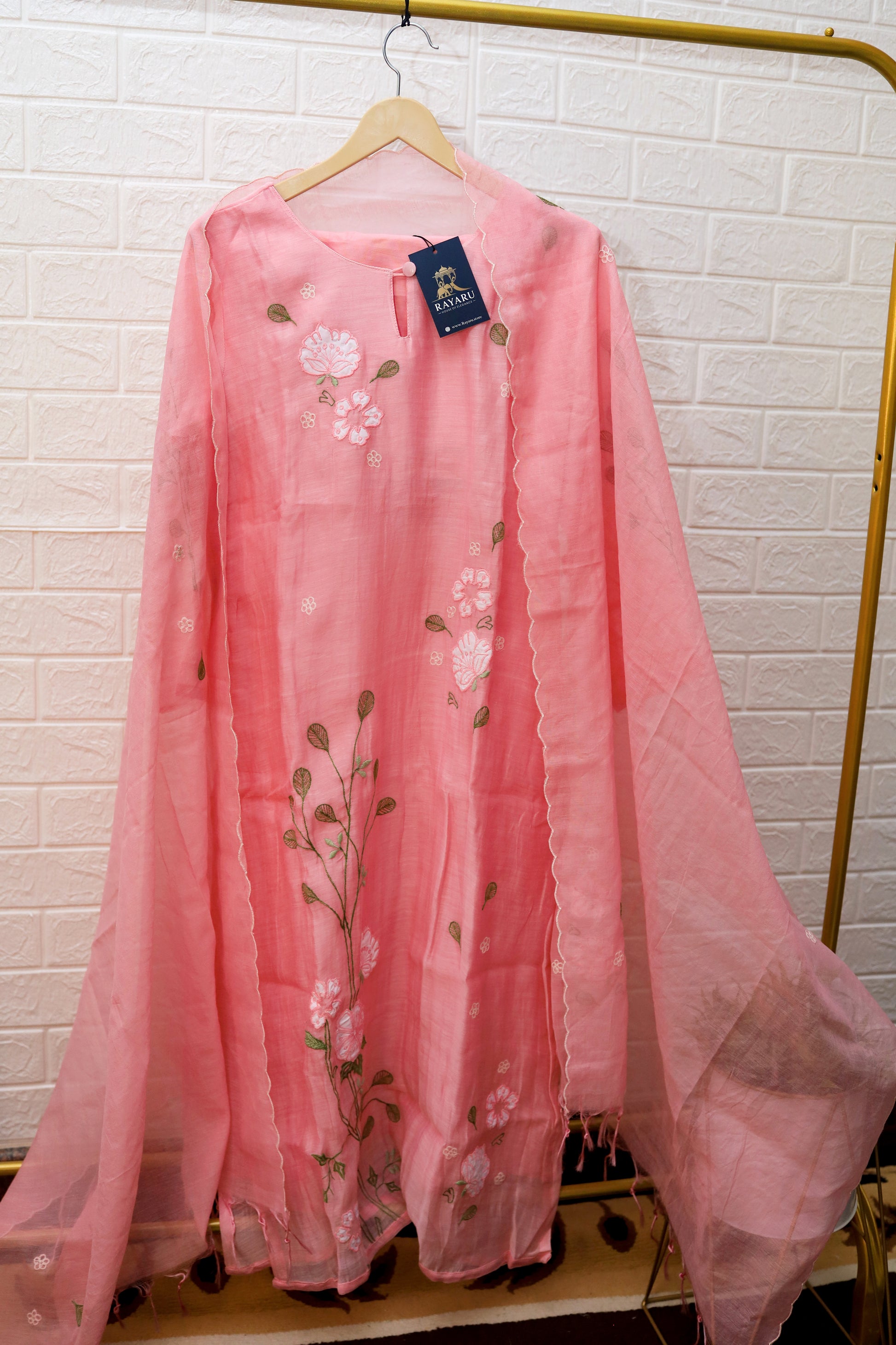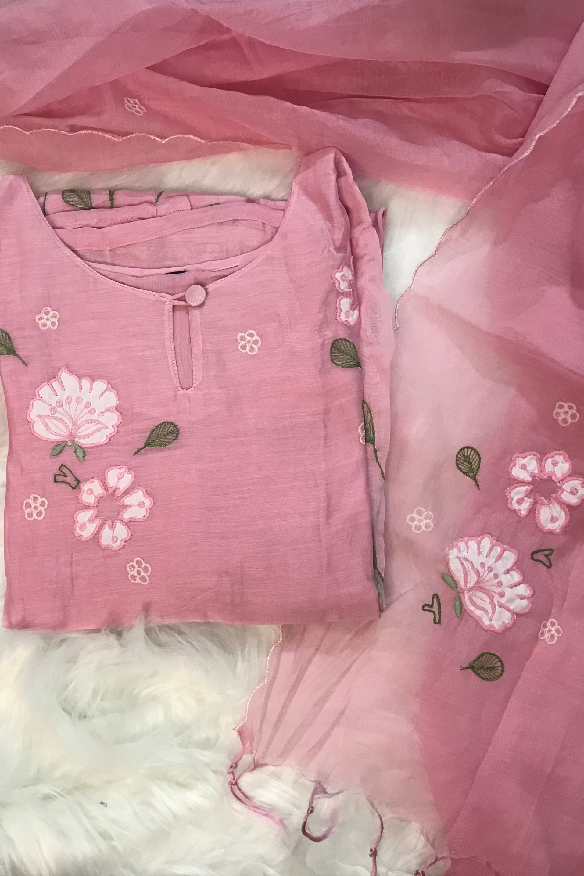 Grace meets simplicity in this beautiful light pink Mul Chanderi kurti set, designed for understated elegance. This 3-piece ensemble includes a soft, flowy kurta, matching bottom, and a delicate dupatta — perfect for simple occasions, casual gatherings, or daytime festivities.