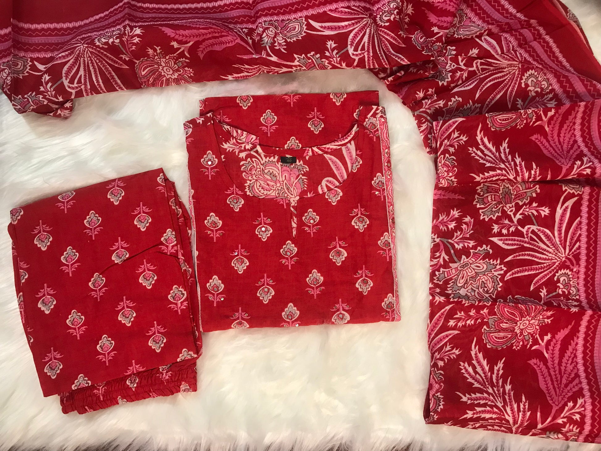 Red Floral Printed 3-Piece Cotton Kurti Set