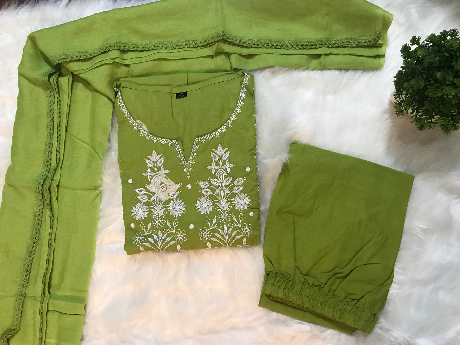This fresh green cotton suit features delicate white floral embroidery, offering breathable comfort and timeless style. Easy to maintain, it’s perfect for everyday wear.